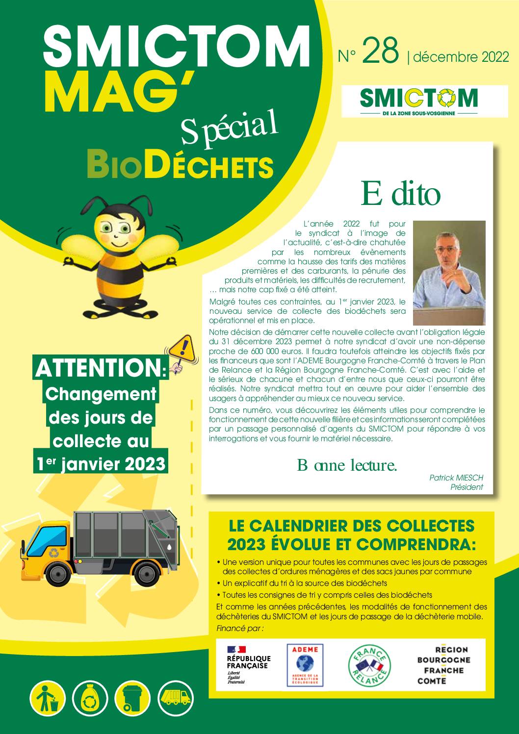 Depuis 2022, le SMICTOM mag’ est disponible uniquement en version numérique. Seul le magazine du mois de décembre (2022) est délivré en version papier (jours de collecte de l’année suivante, bon de commande concernant les composteurs, …).